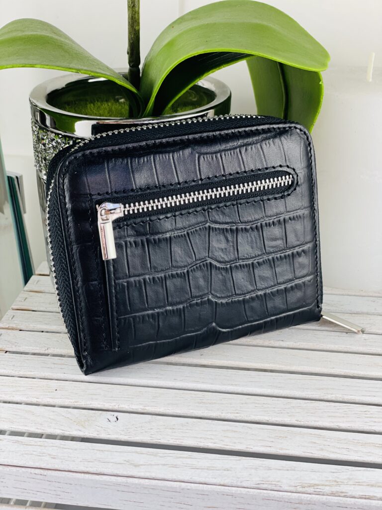 Портмоне Mario-8810 черный крокодил из натуральной кожи. На молнии. Внутри 2 отделения для купюр, 4 для пластиковых карт. На задней стенке отделение на молнии, монетница. Подкладка из полиэстера с логотипом. Удобный, маленький кошелек, не займет много место в женской сумочке или клатче.